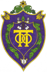 Fraternity crests are designed to reflect the values, history, and identity of the organization and often carry considerable symbolism and history. Notable elements in the OPiO crest include the purple background, gold border, yellow flowers and green leaves, green laurel branches, interlocking “O” and “Π”, and crossed books.